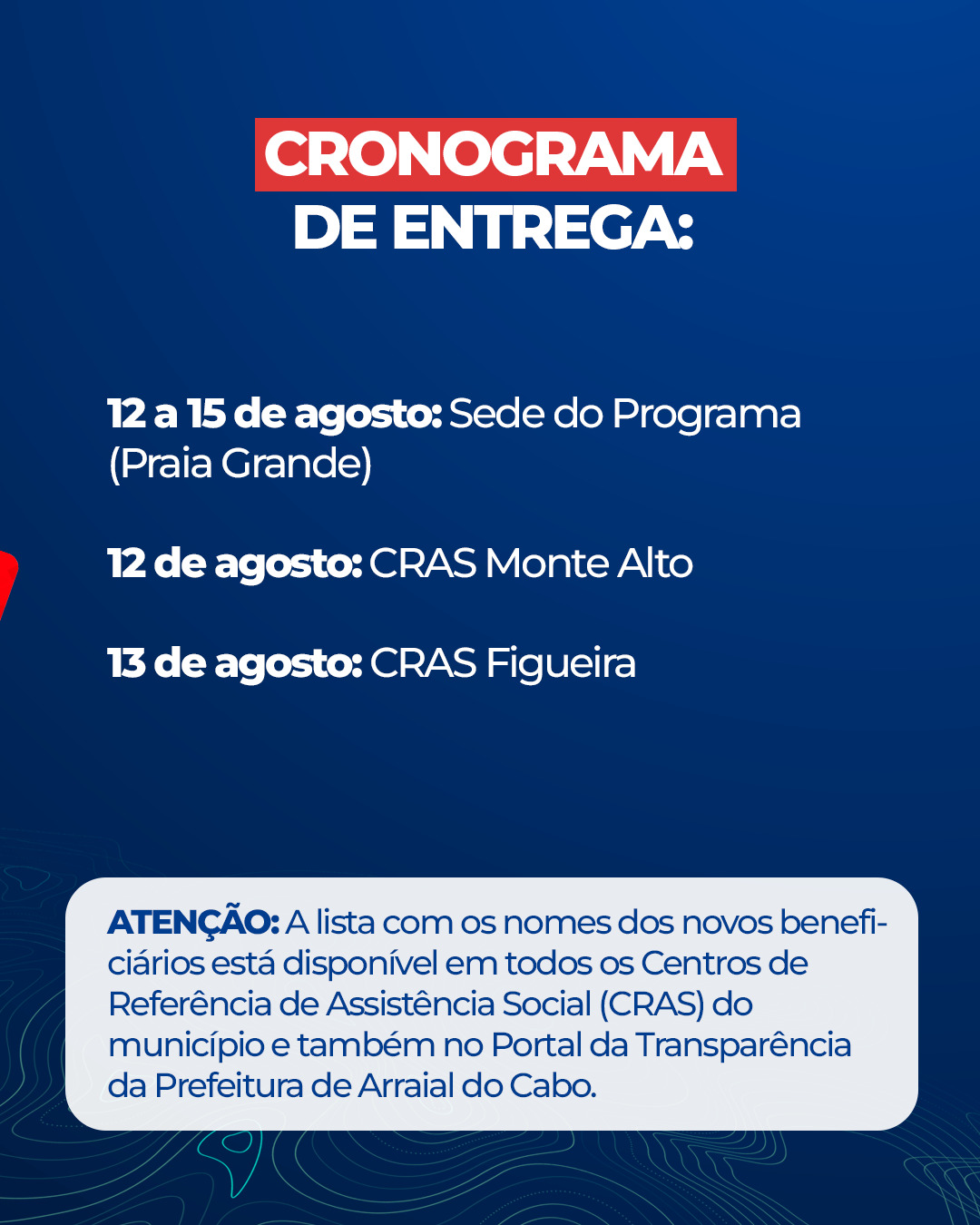 Para participar, é preciso estar inscrito no Cadastro Único e cumprir os requisitos da Lei Municipal nº 2.292/2021. A lista oficial com os nomes está disponível nos CRAS e no Portal da Transparência da Prefeitura de Arraial do Cabo.