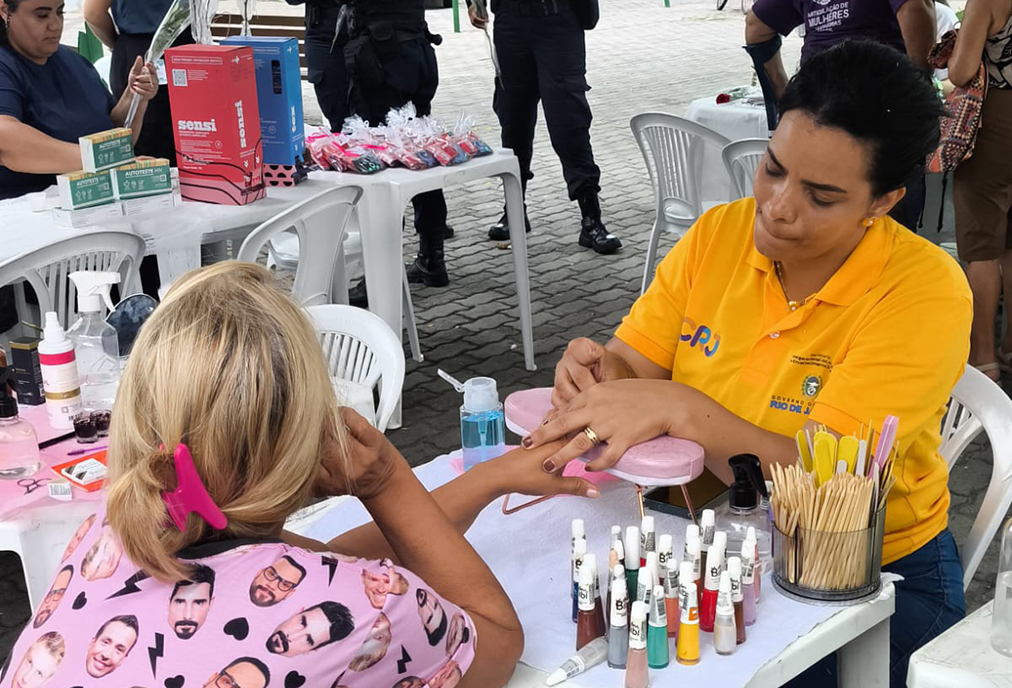 O público também teve acesso a serviços de cuidados pessoais, como design de cílios e sobrancelhas e esmaltação simples de unhas. As atividades foram realizadas com a participação da equipe da Secretaria de Estado de Juventude e Envelhecimento Saudável.
