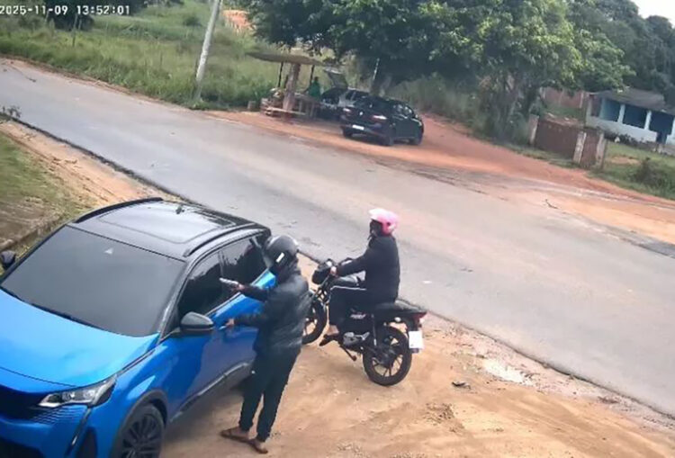O ataque aconteceu pouco antes das 14h, no momento em que o motorista chegava a um sítio. Câmeras registraram o carro se aproximando do portão da propriedade quando dois homens em uma moto encostam logo atrás. Um dos suspeitos desce armado e ordena que o motorista abra a porta do veículo.